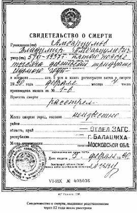 Свидетельство о смерти В.А.Амбарцумова, выданное родственникам через 52 года. "Причина смерти - расстрел".