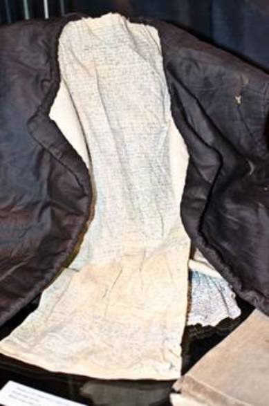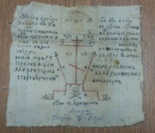 Текст молитв, зашитый в подкладку одежды. Заключенный, носивший такую одежду, подвергал себя смертельной опасности, если бы молитвы были обнаружены. Выставка "Преодоление", М. 2012 http://www.pravoslavie.ru/smi/57695.htm