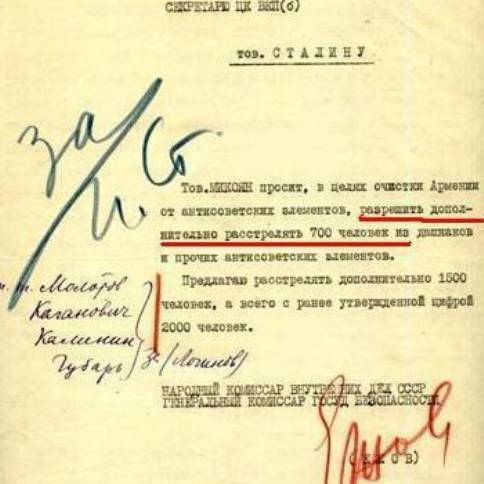 Из солнечной Армении: «Тов. Микоян просит в целях очистки Армении от антисоветских элементов разрешить дополнительно расстрелять 700 человек из дашнаков и прочих антисоветских элементов.