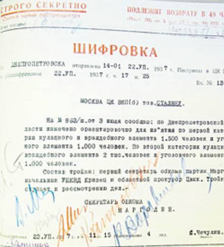 Шифровка.«На № 863/ш от 3 июля сообщаю: по Днепропетровской области намечено ориентировочно для изъятия по первой категории кулацкого и враждебного элемента 1500 человек и уголовного элемента 1000 человек. По второй категории кулацкого и враждебного элемента 2000 человек и уголовного элемента 1000 человек».
